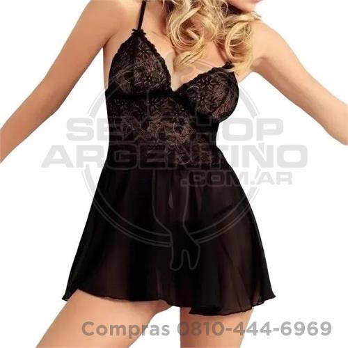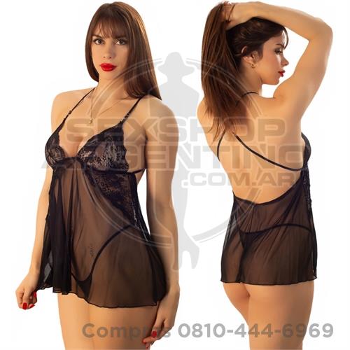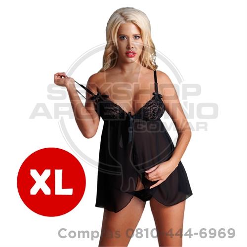 Baby Doll Negro en Gasa con Busto Abierto y Colales