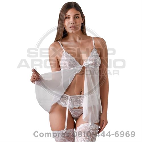 Baby Doll Blanco en gasa con Busto Abierto y Colales