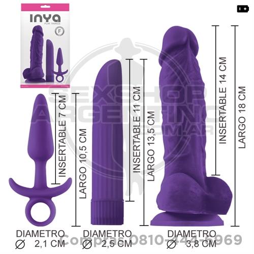 Kit de Dildo 5 con sopapa,Vibrador rigido y plug anal violetas.